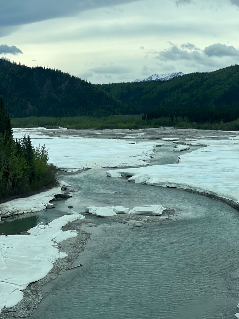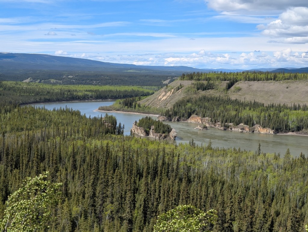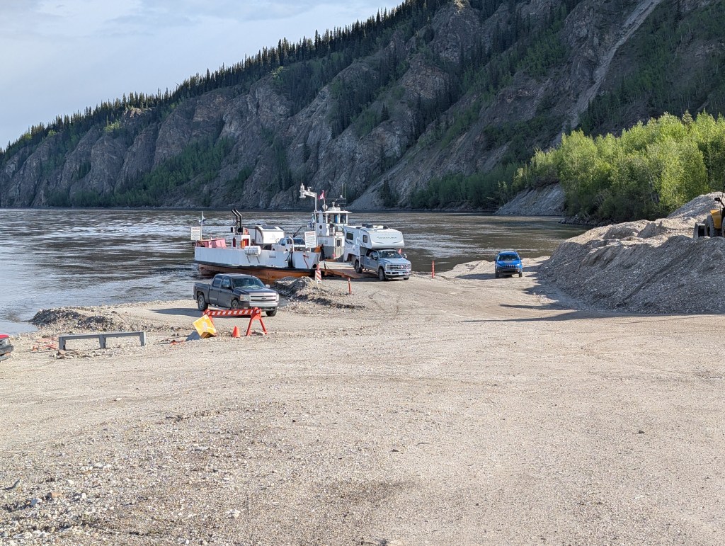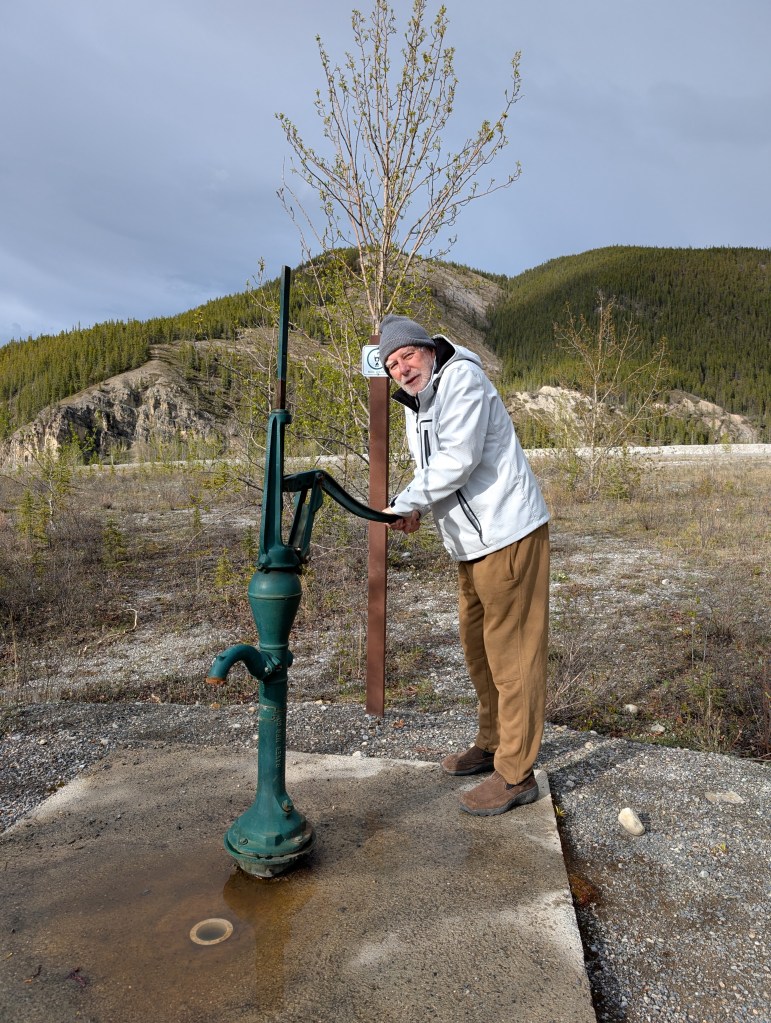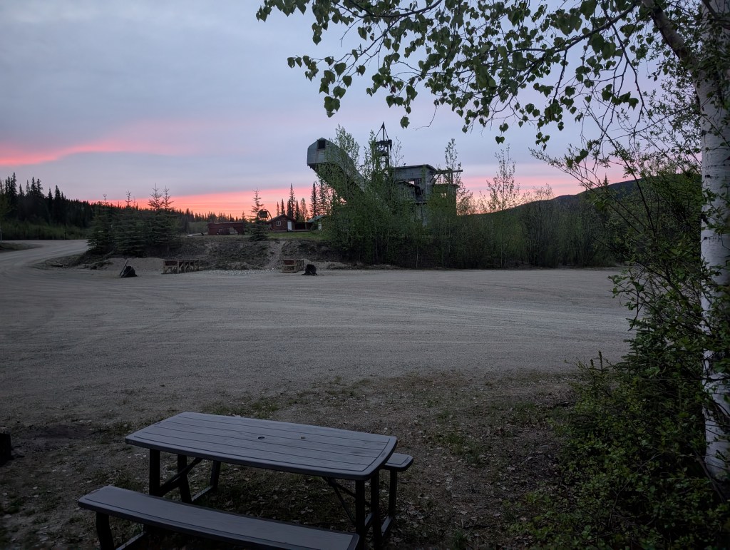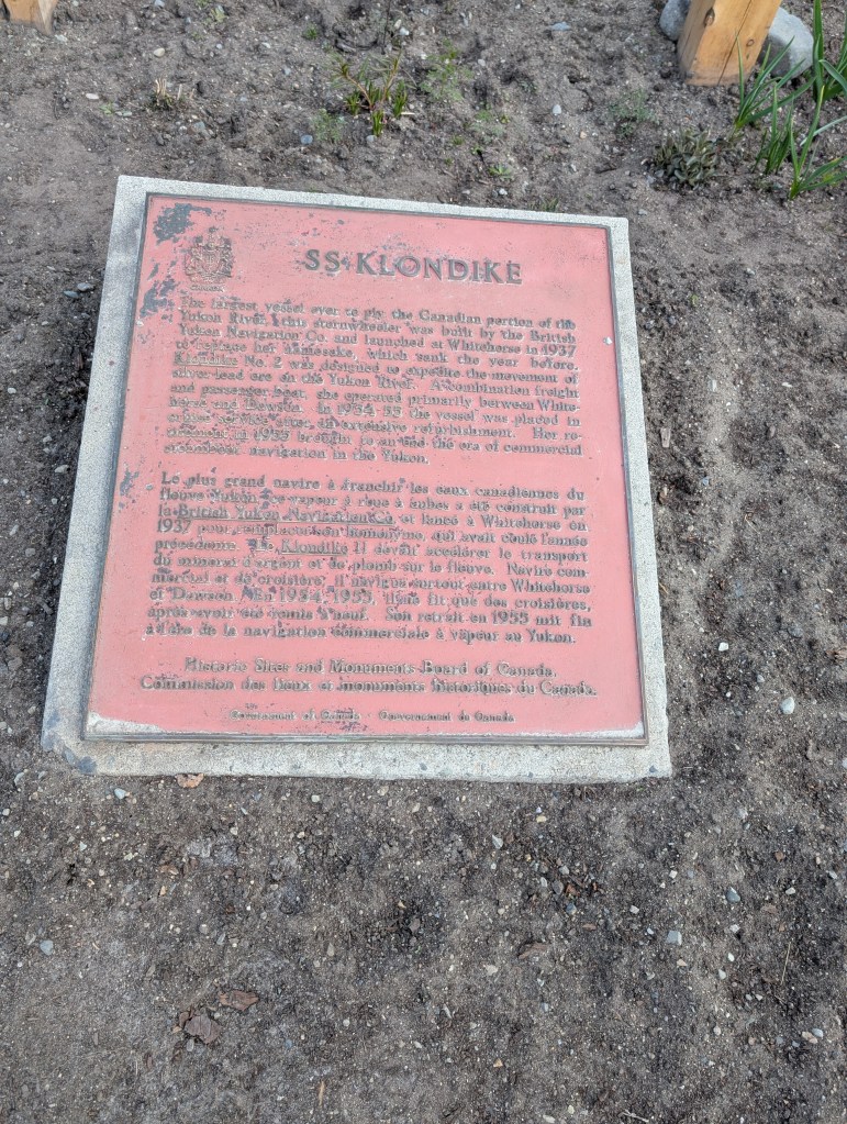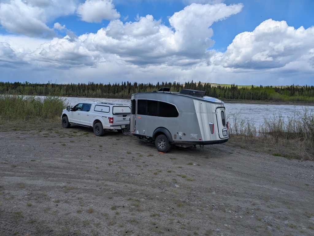 Pelly Crossing for the night. It’s a “First Nation” campground right on the Yukon River. Free boondocking. I was a bit nervous about the proximity of our rig to the water with potential for Spring runoff increasing the flow. I placed a rock a foot from the water and went to bed. In the night I monitored my rock. The result? My rock was in the water and river level had risen about 2″. No more water front river camping in the Spring!