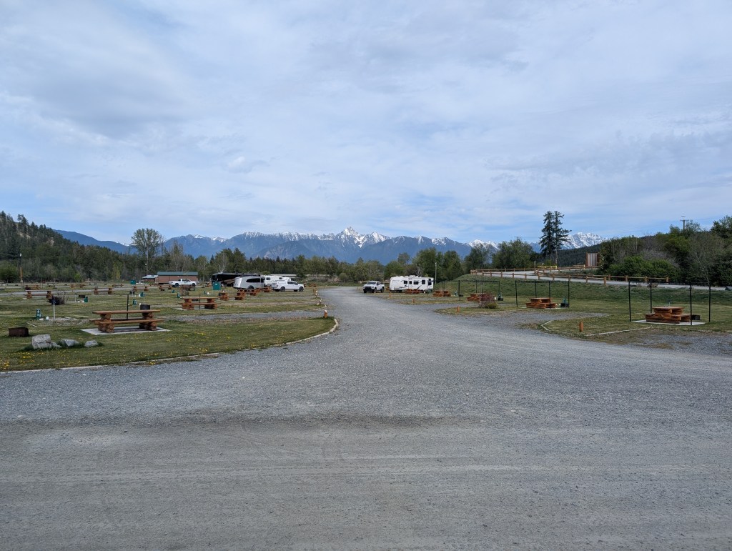 Crossed the border into Canada via Bonners Ferry, Idaho. Crossing was simple… show your passports; explain where/what are you visiting in Canada. Now camping in Cranbrook, BC at the base of the Canadian Rockies and will next travel northward to visit Banff National Park. Went around Cranbrook trying to find bear spray to no avail. I guess the local bears are well-behaved 😉