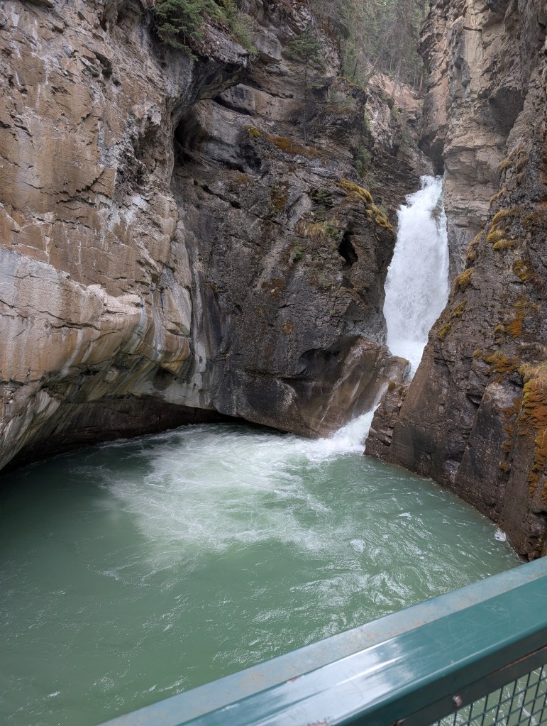 Johnston Canyon is actually a gorge about 5 miles long that features 7 waterfalls and a cave viewing portal. It’s the #1 tourist destination in Banff. Not surprisingly, it was overrun with tourists, even late in the afternoon.