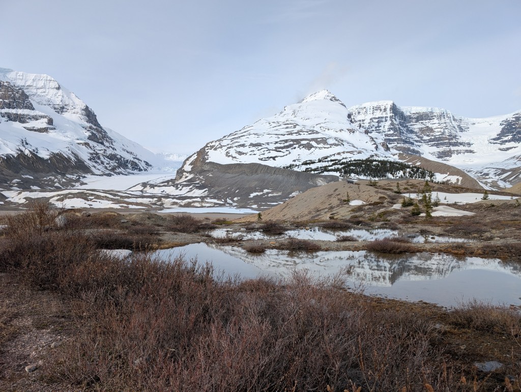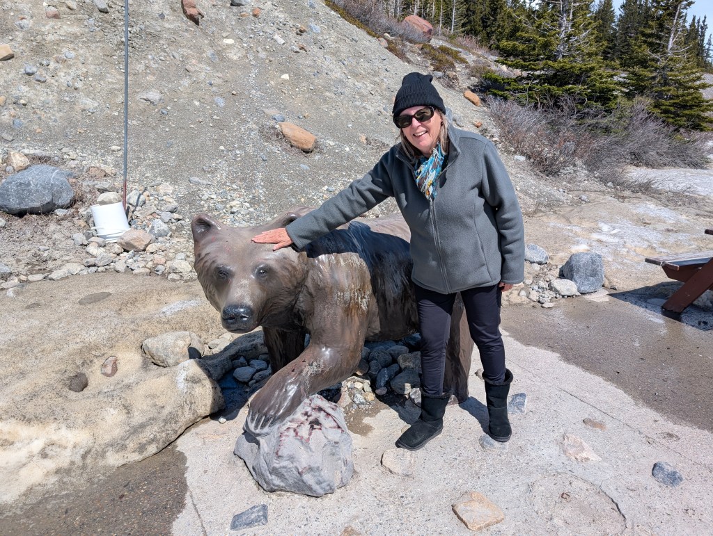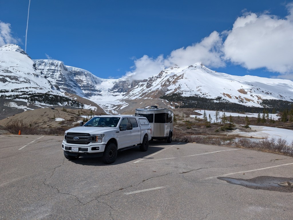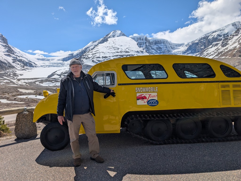 <Thursday May 15> Now heading up Hwy 93 along the Columbian Icefields Parkway. Incredable, towering mountains along the highway. Got up to ~7,000′ a few times which literally took our breath away. Arrived at the Columbian Icefields Visitor Center to spend the night boon-docking in their RV area. I had been to this area 50 years ago… what changes!!! The Columbian Glacier has receded almost ½ mile and the area has become a tourist destination. To our surprise, they had a Starbucks so we opted for some very pricey hot chocolate. It is cold so we will bundle up tonight.