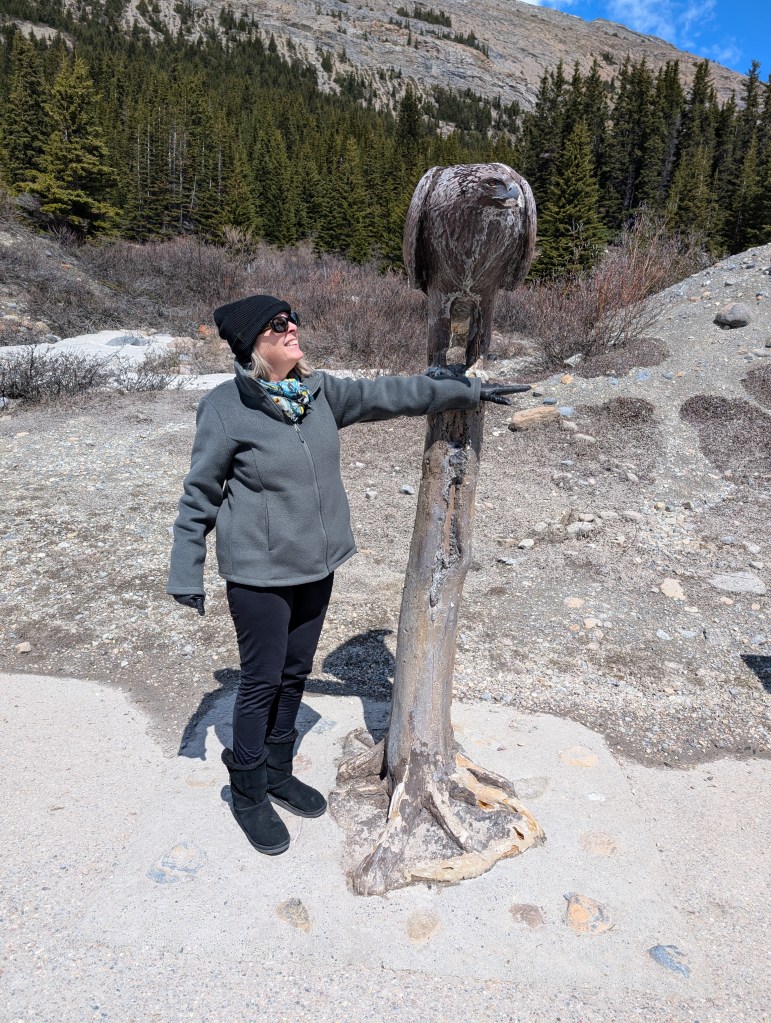 More just for fun. Becky posing with faux eagle and grizzly bear to impress the grandkids. Earlier I missed a great photo opportunity when a chipmunk tried to run up Nana’s pant leg.