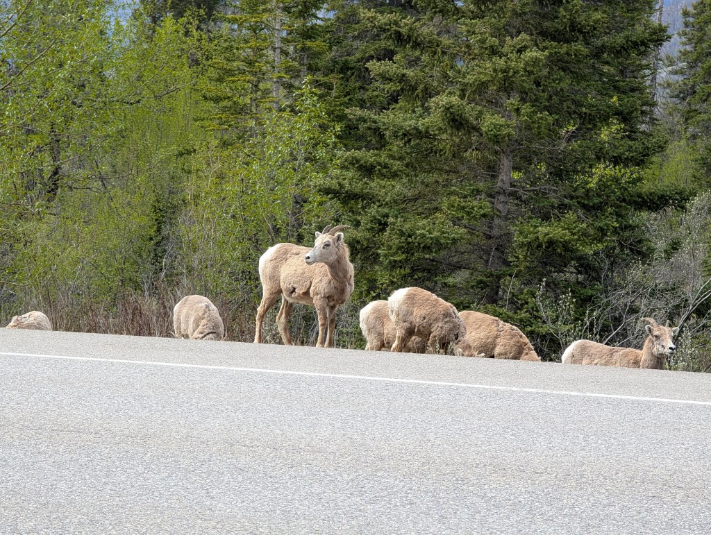 The drive northbound from Jasper was slow-going. We encountered many herds of Mountain sheep along and on the road. Lots of babies and surprisingly rams.