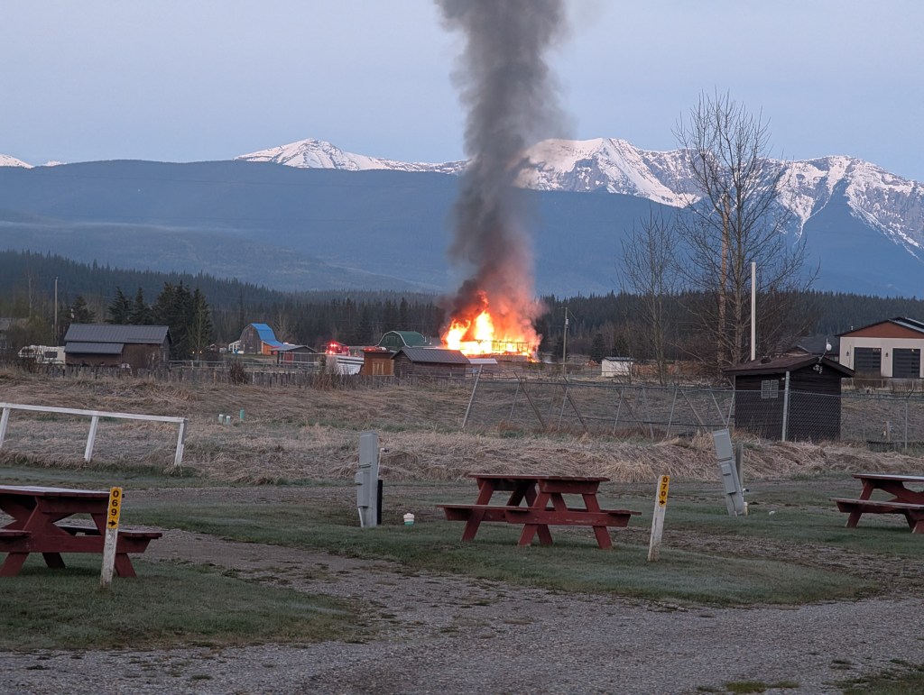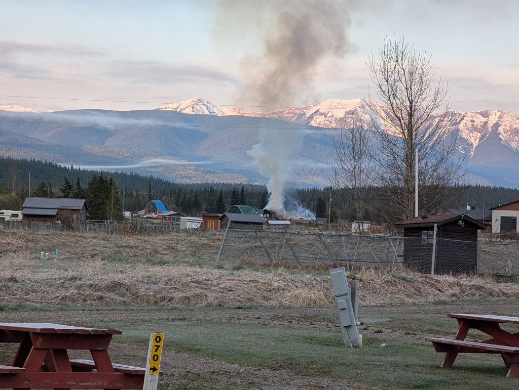<Monday May 19> Woke up to the strong smell of smoke a few minutes before 5am. A 1/2 mile away there was what appeared to be a “bonfire”. In a few minutes the “bonfire” grew and engulfed an entire house. Becky called 911 and I knocked ice off of everything and packed anticipating a quick move. We left about 8am and the fire had almost burned itself out.