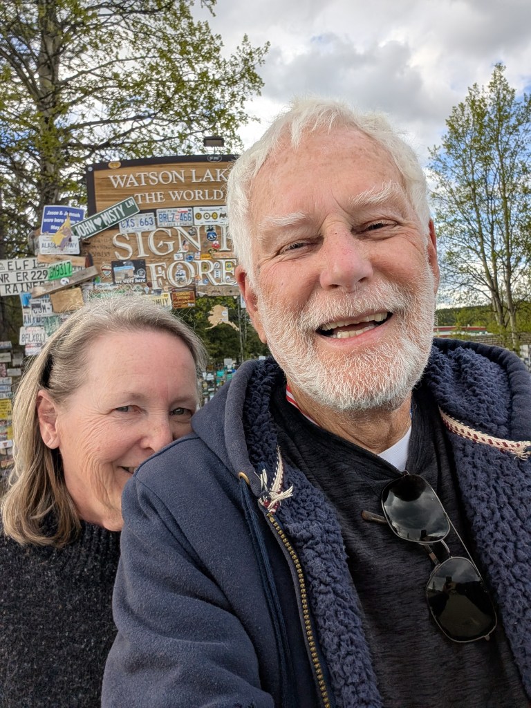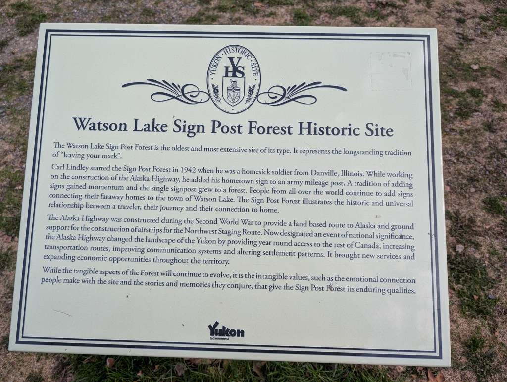 <Sunday May 25> Watson Lake is world-famous for it’s sign post forest. Started in 1942 by a homesick soldier building the ALCAN Highway. There are now 1000’s of street signs, personalized plates and graffiti.