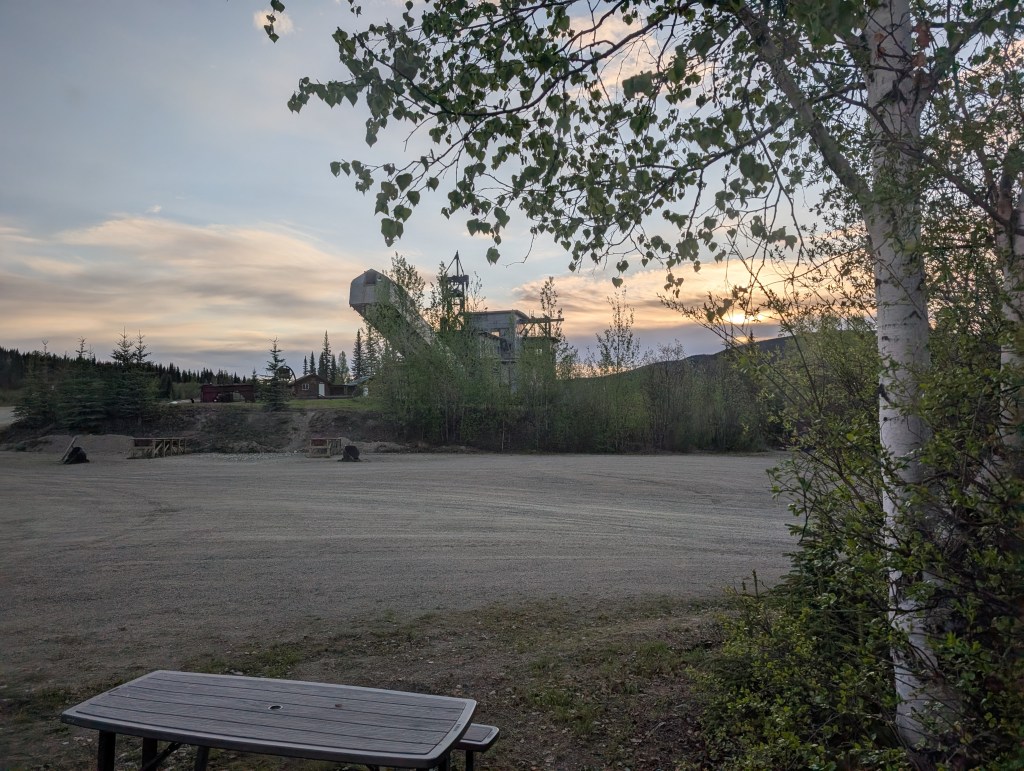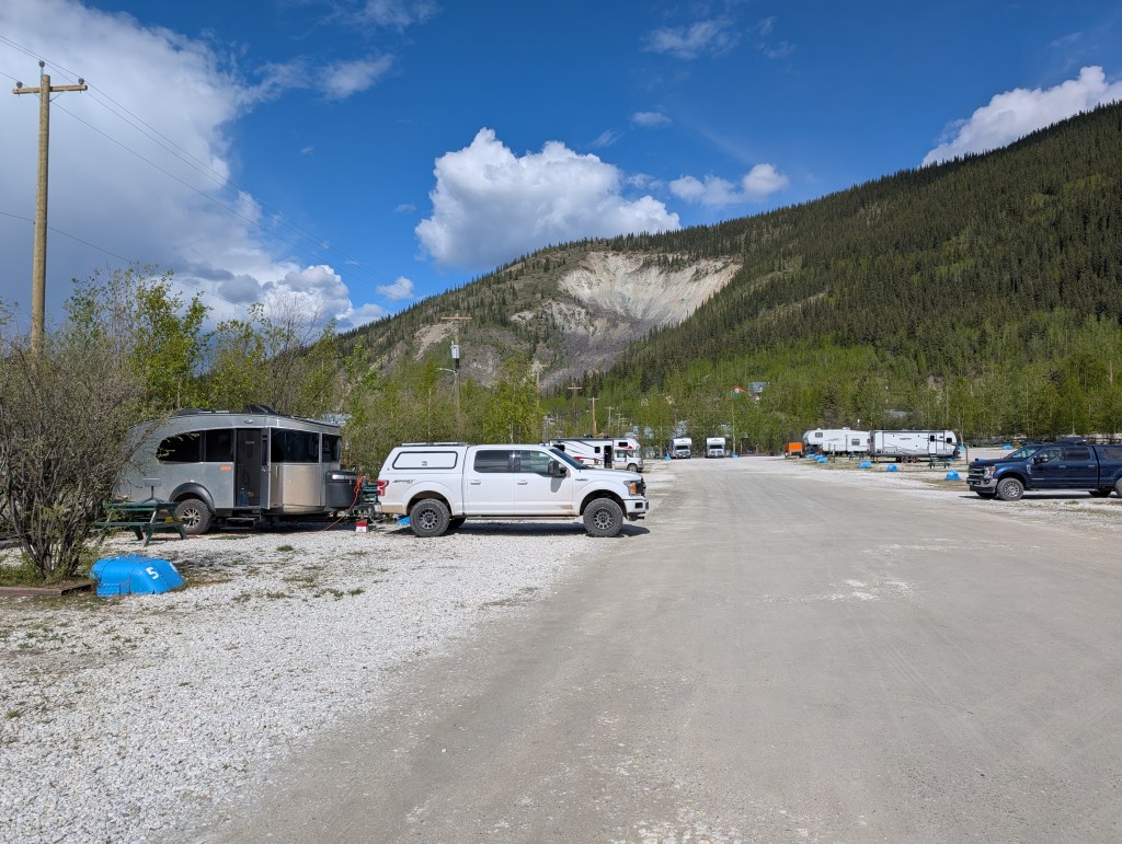 Arrived in Dawson City and setup in a local RV park. The giant hillside slide in the background is several 1000 years old. The blue object in the foreground delineates individual sites and was repurposed from a gold dredge.