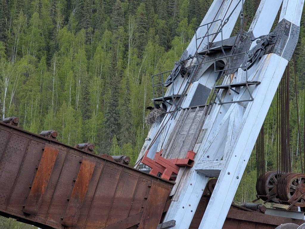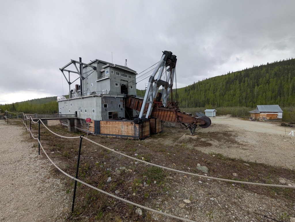 <May 31 Saturday> Field trip day. Drove out to see the gold discovery site and Dredge #4. It was about 15K up Discovery Creek/Canyon on a dirt road. Lots of evidence of dredging past and current. The #4 dredge shut down in 1956 but managed to extract enormous amounts of gold. To its current resting site, it literally chewed its way 15K in a moving, self-serving pond. This required thawing permafrost, removing overburden and extracting gold-bearing material down to 40′.