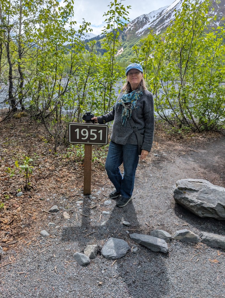 Where Becky is standing is the base of the Exit Glacier in 1951. In a relatively short time it has receded 1000’s of feet.